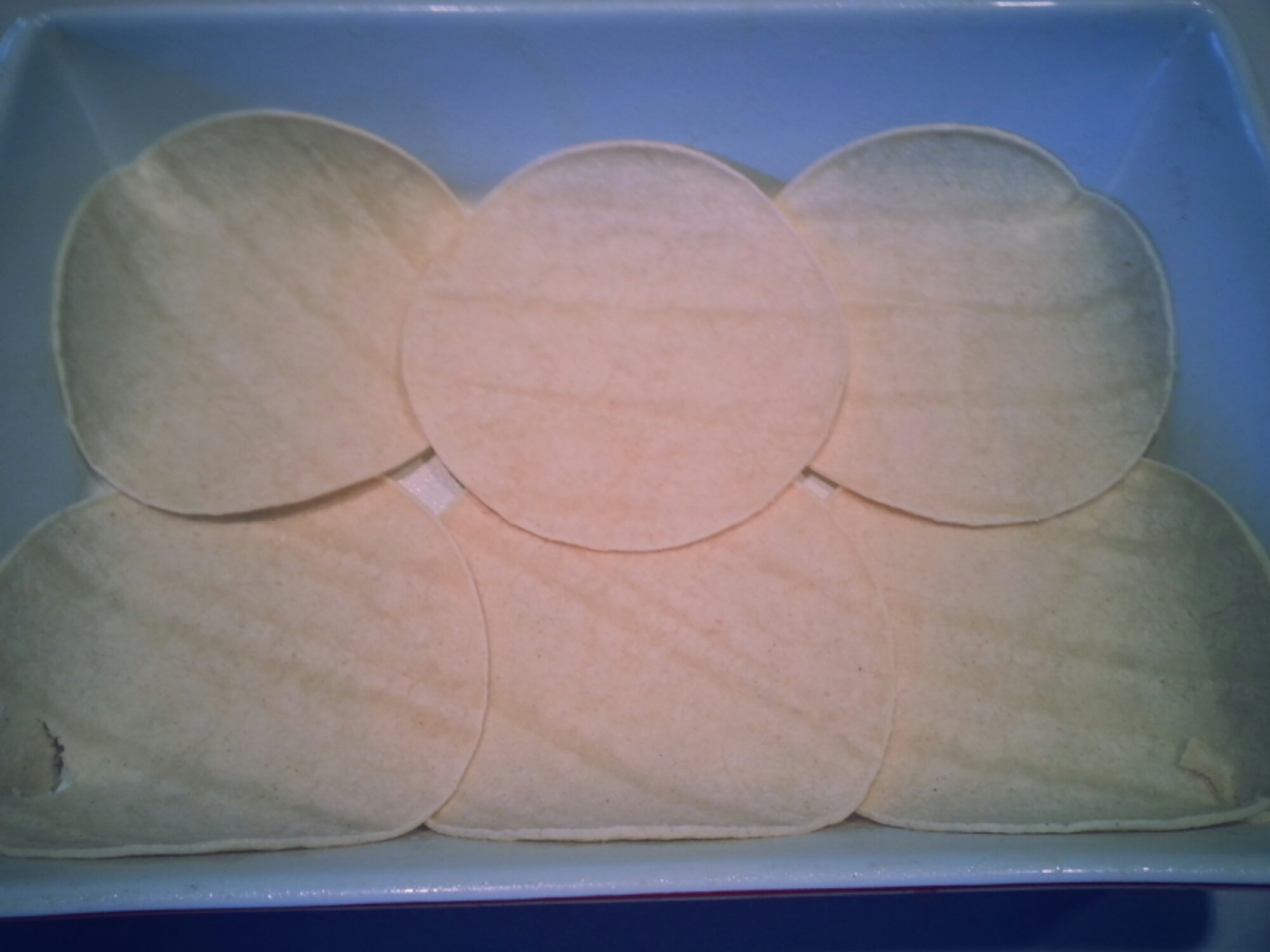 (Just cover the entire bottom with a thick layer of tortillas and lay mixture on top)