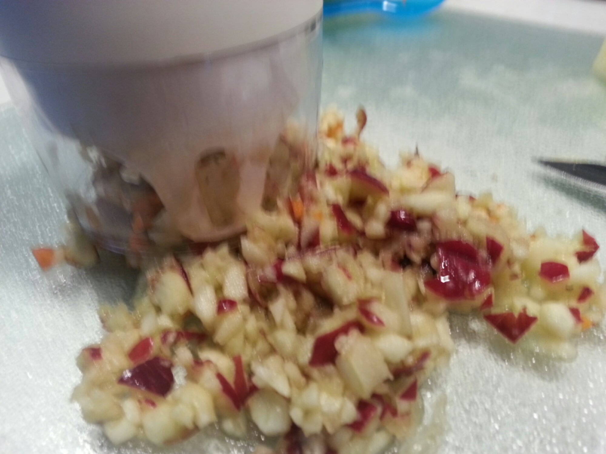 With a food chopper, chop the apples into small pieces. I make sure they are extremely small for my son’s sake. Add to the mixture.