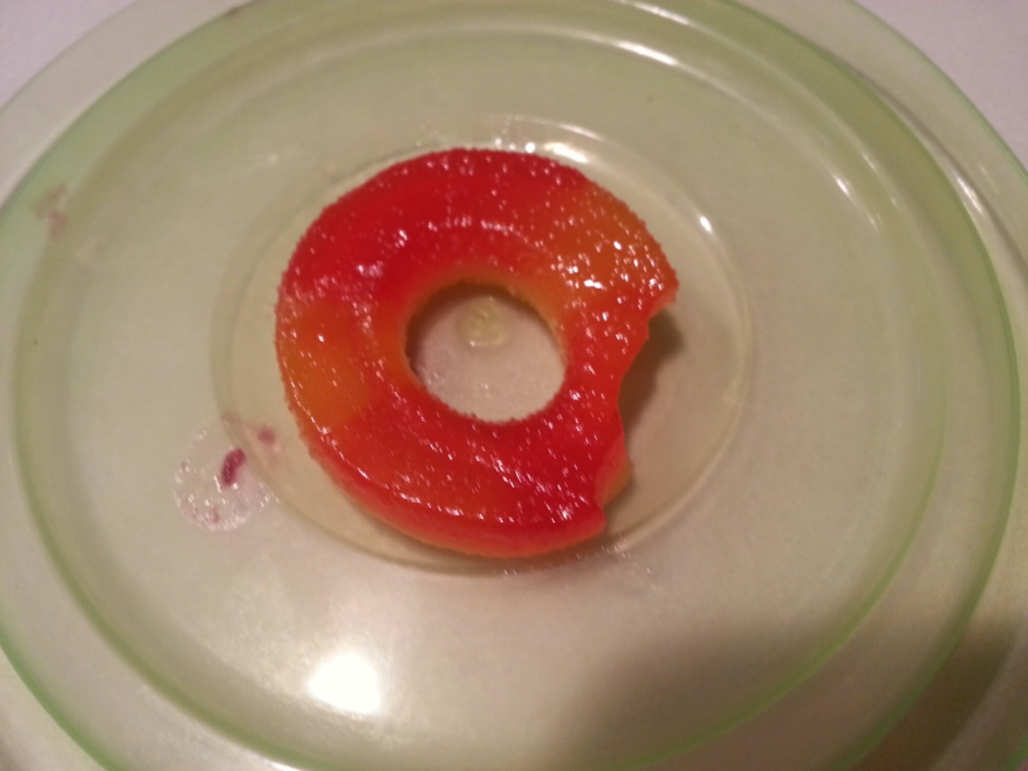 He got into the container of Peach O’s that my husband left out…. This was the funniest sight I’ve seen in quite awhile. When I peeked in the tent he had the entire Peach O in his mouth gnawing extremely fast trying to get a bite off of it.