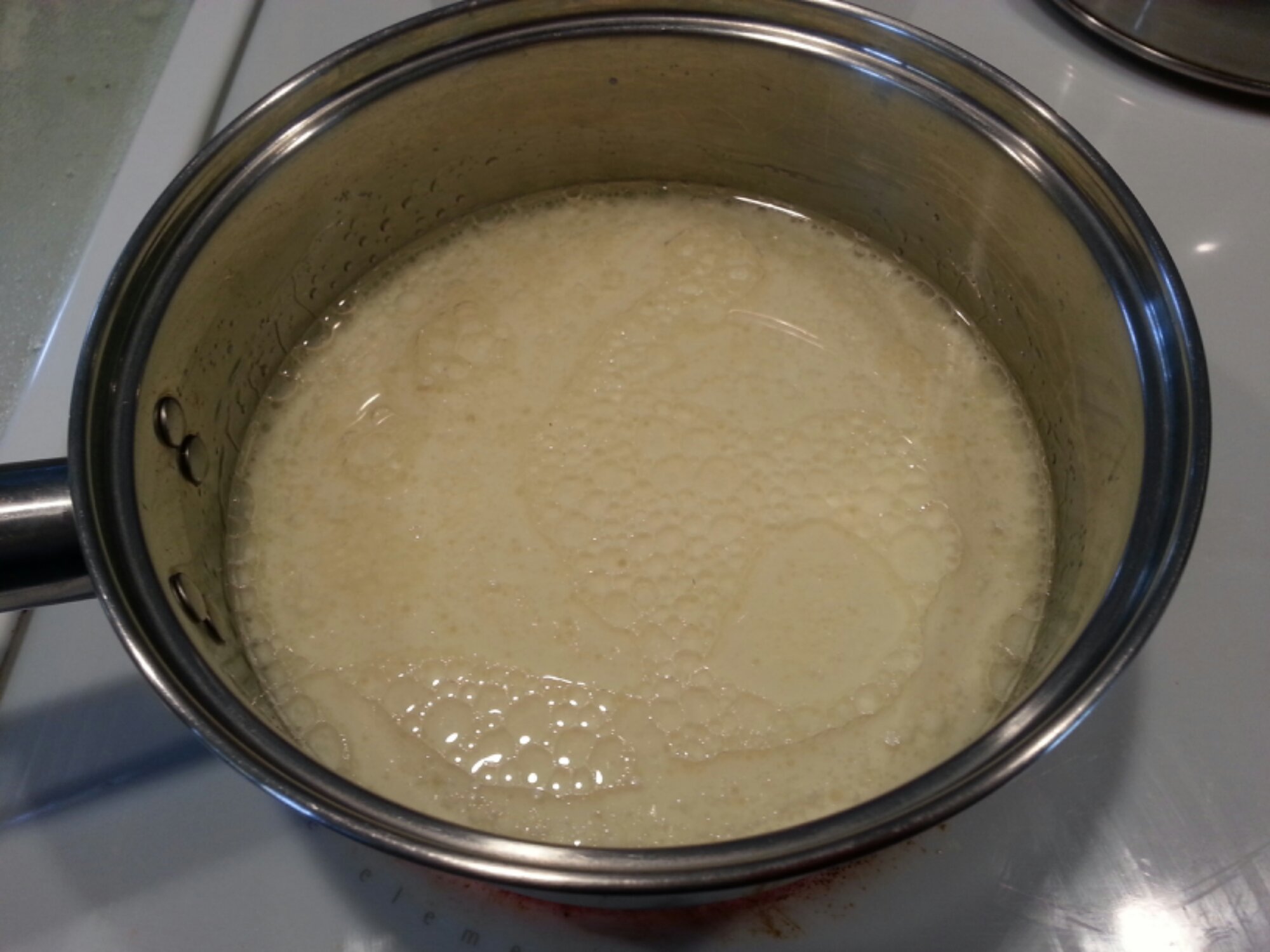 When the mixture is lukewarm but NOT hot, add yeast and stir. Let this sit for a minute and then add 4 cups of flour. Stir mixture together. Cover and let rise for at least an hour. I keep it on the stovetop with a tea towel atop and let it rest in the same saucepan.