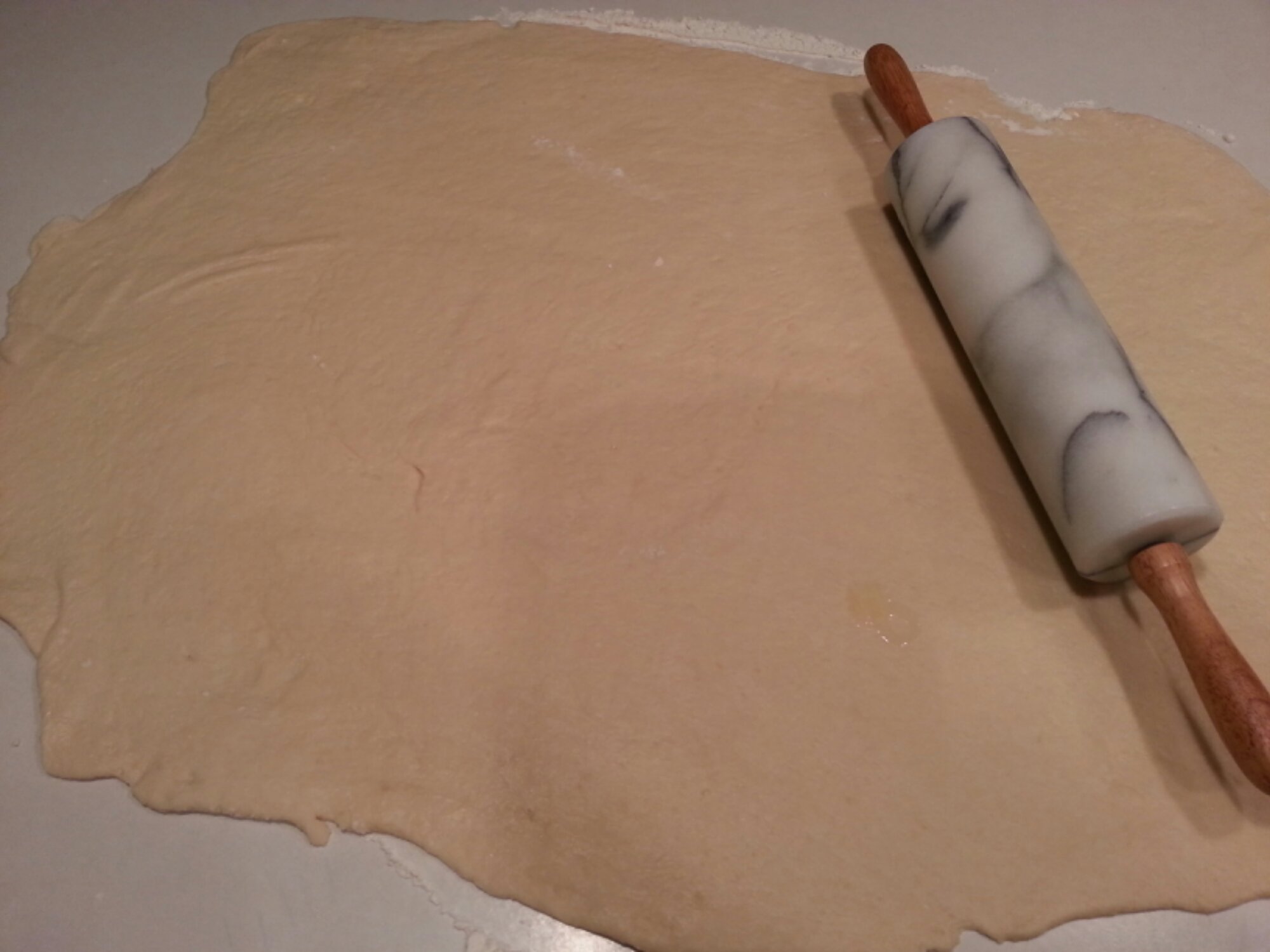 Using a rolling pin, gently tap the dough starting from the center of the dough and working outward, until the square becomes larger and the butter begins to soften. Fold dough back up placing the corners in the middle of the dough and repeat the rolling process three times to get the butter mixed well into the dough. Make a 14″ square while keeping the surface well floured.