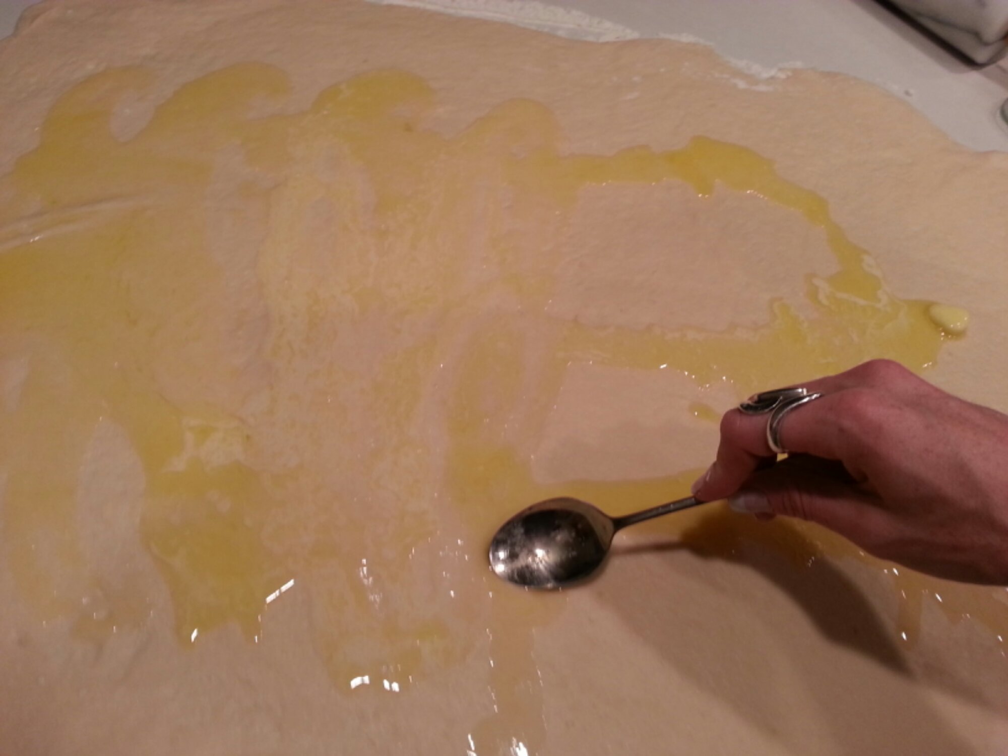 Sprinkle surface generously with flour and roll the dough into a thin rectangular shape. Brush melted butter on top, then sprinkle sugar over the butter, and finish with cinnamon.