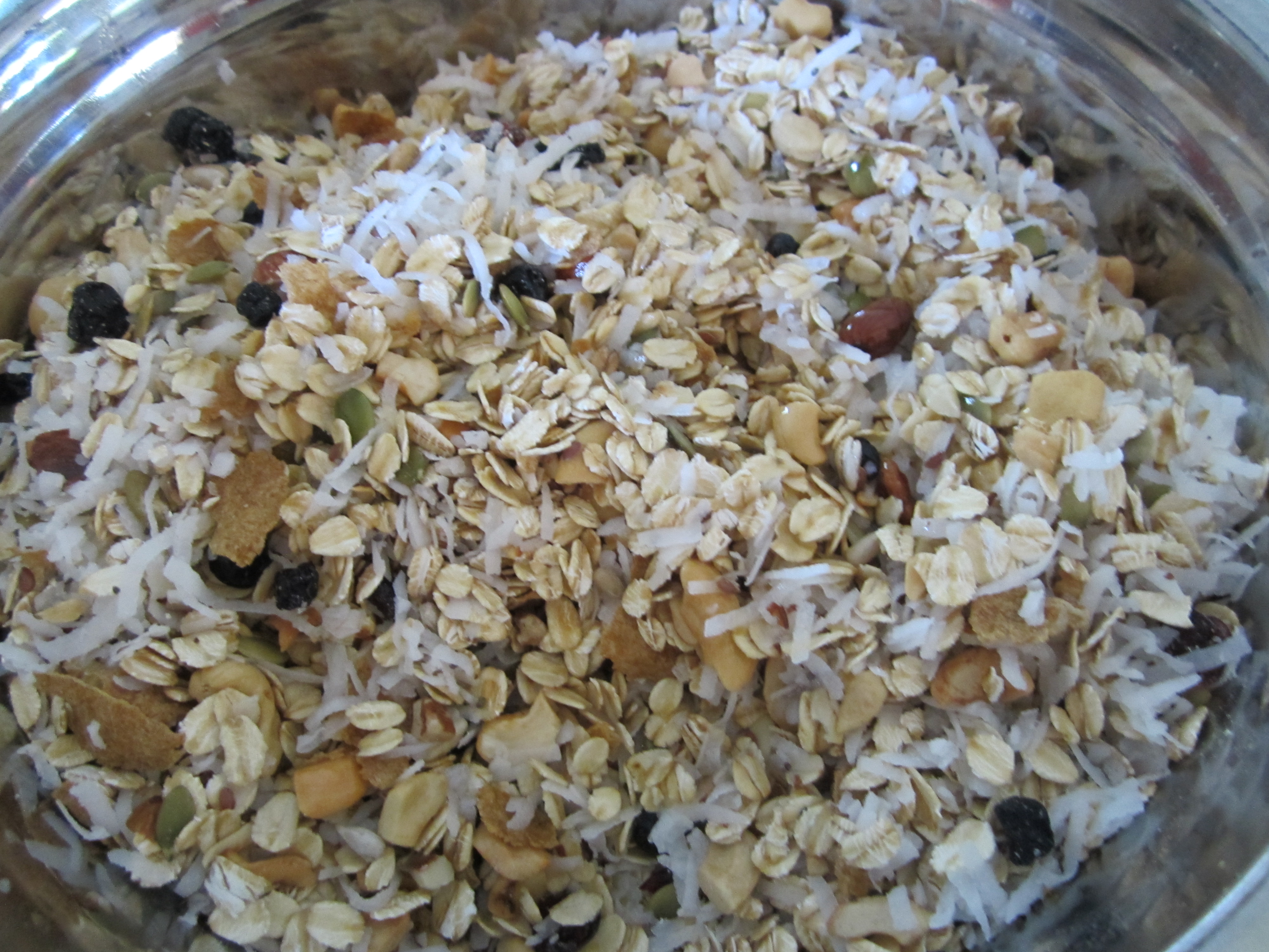 In a large bowl add oats, bran flakes, coconut, nuts and seeds.