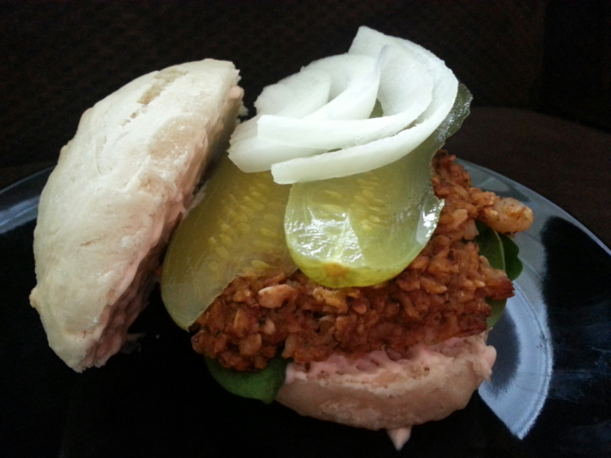 Lets just say that the blue cheese crumbles melted within this giant black bean burger is to die for. You do not want to opt out of using blue cheese crumbles as this adds lots of flavor and pairs perfectly with the spicy spread.