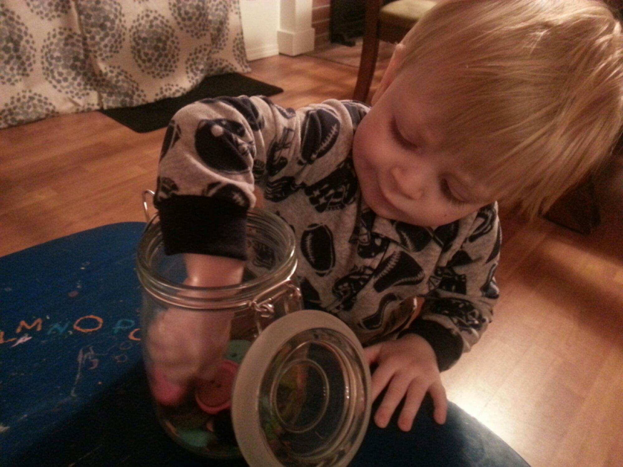 Yes it becomes messy but is very enjoyable for them. I was rolling out pizza crust and Cooper sat on the counter playing with the flour. Mind you the kitchen looked as if a snow storm hit. It was actually really fun to watch him “measure” the flour. - Playing with my button jar. I have a jar full of buttons for decoration but Cooper has turned it into a toy. :)