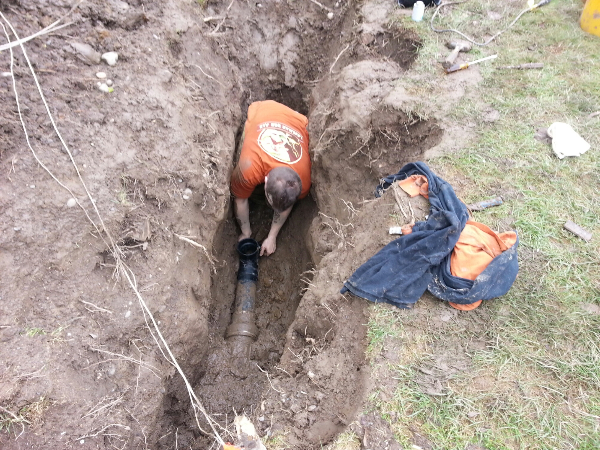 I head in to check on my sleeping babe as my husband remained outside the whole time I was gone because he was covered in mud or feces, I’m not too sure which. I peek out the window now and again to see him hidden deep within the hole and other times see him frustrated at life. I knew he wanted to quick long ago, yet we currently had no running water and wouldn’t have running water until it was fixed. Finally, 5 hours later and after MANY complications, he got the pipe connected. He added a cleanout as this has been a major problem that it would be easier to access with a cleanout readily accessible. Once it was connected (minus the cleanout) we had me flush both toilets.