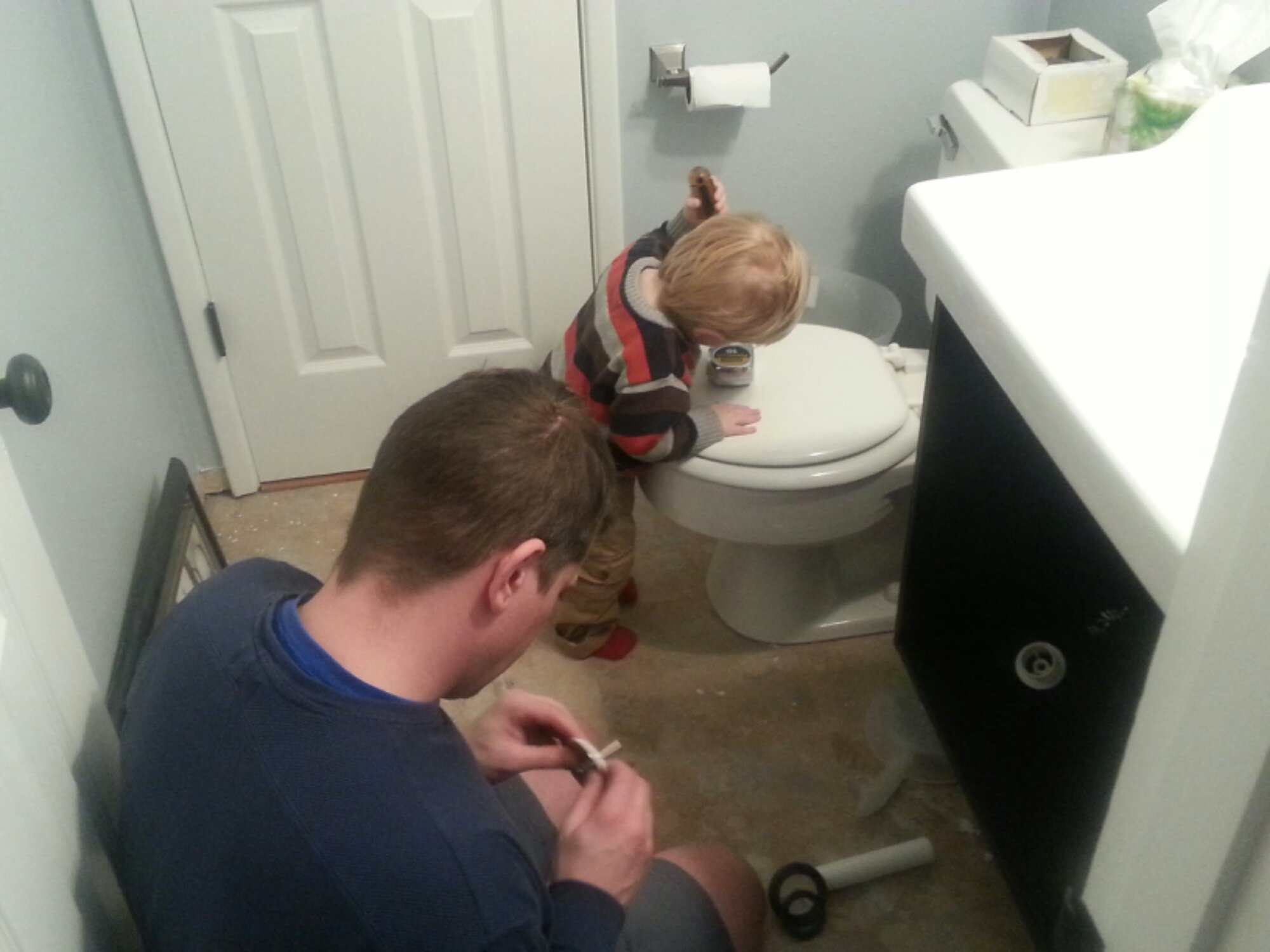 After the park we headed home to the bathroom that is getting remodeled while Cooper insists on helping daddy and doing a very maticulous job at it I must say.