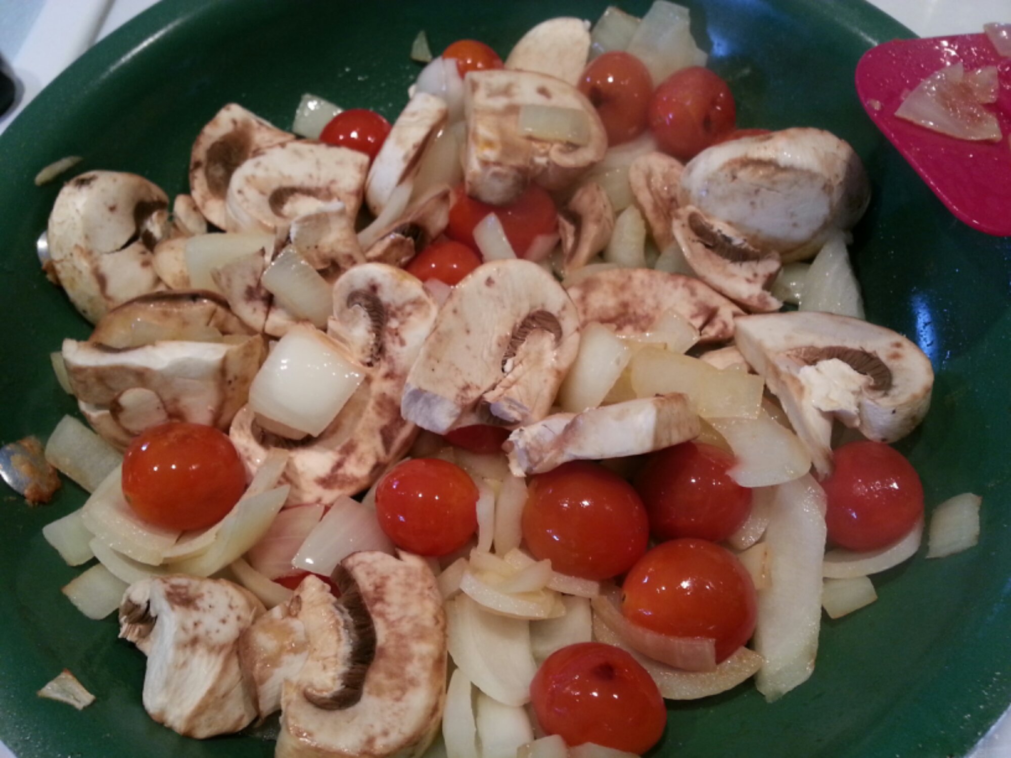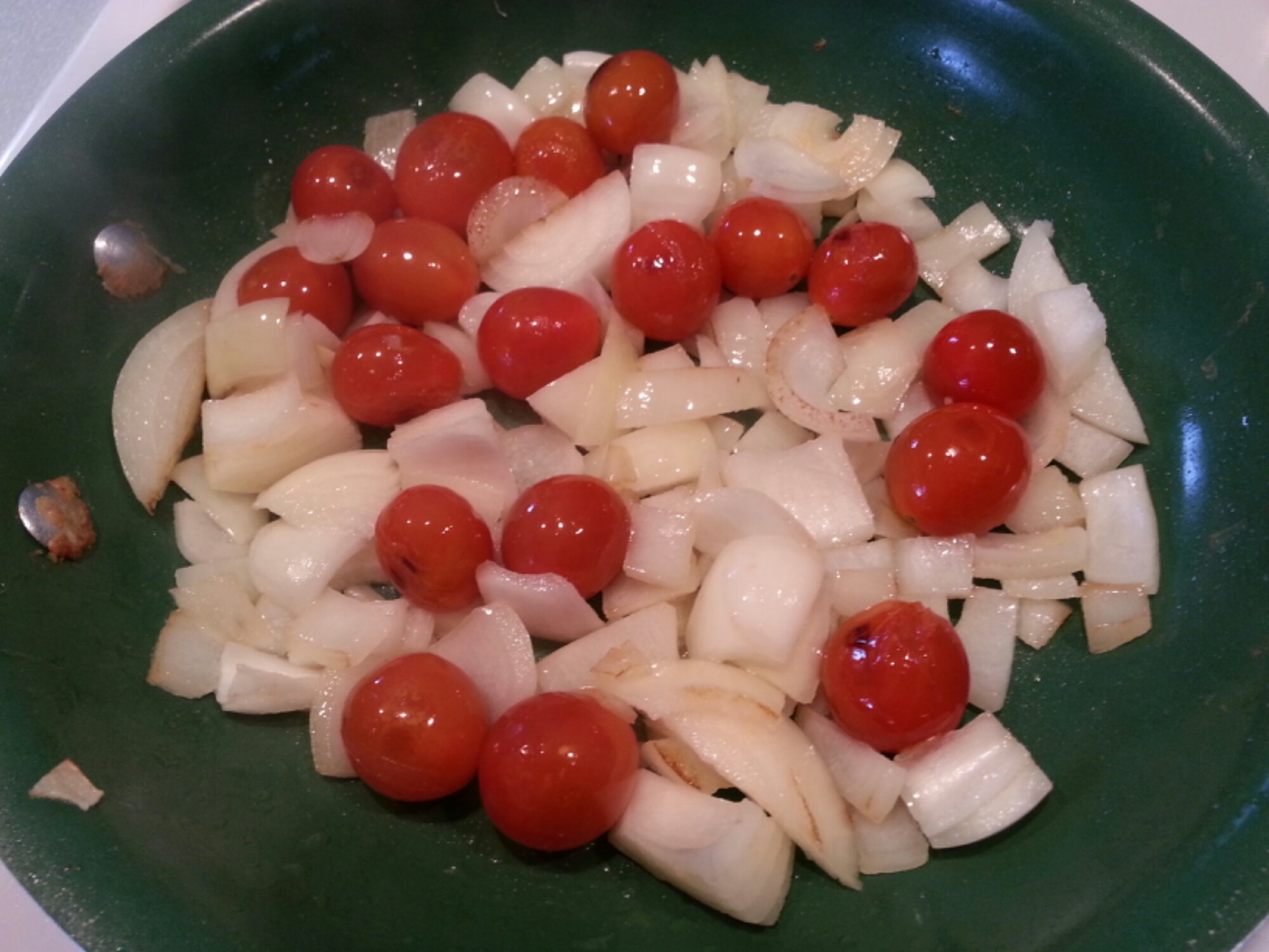 In a fry pan add a little EVOO and cherry tomatoes and begin to cook on medium heat. Meanwhile chop onions and add them to the tomatoes.