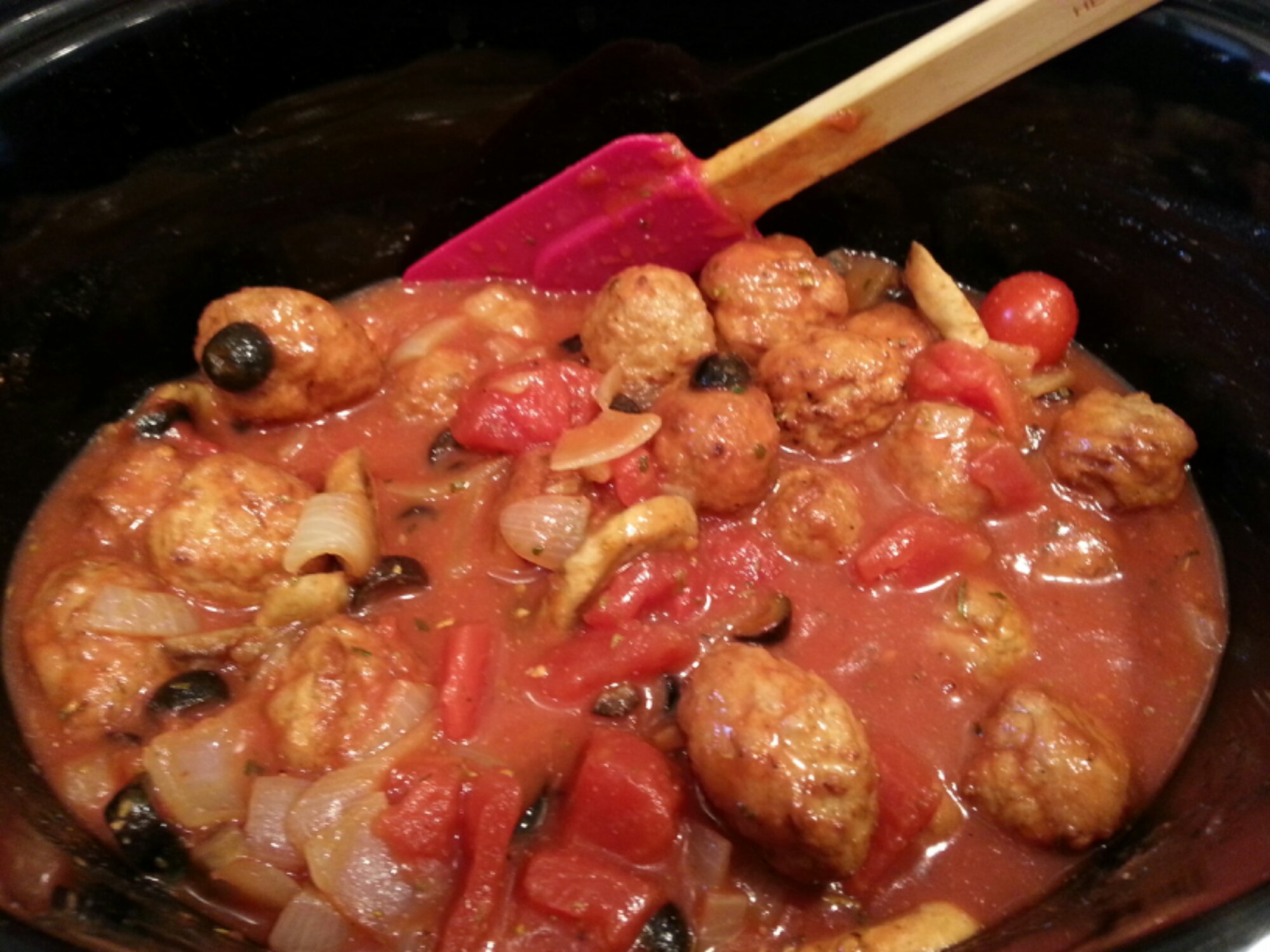 Once tomatoes fully burst add olives and transfer to crockpot.